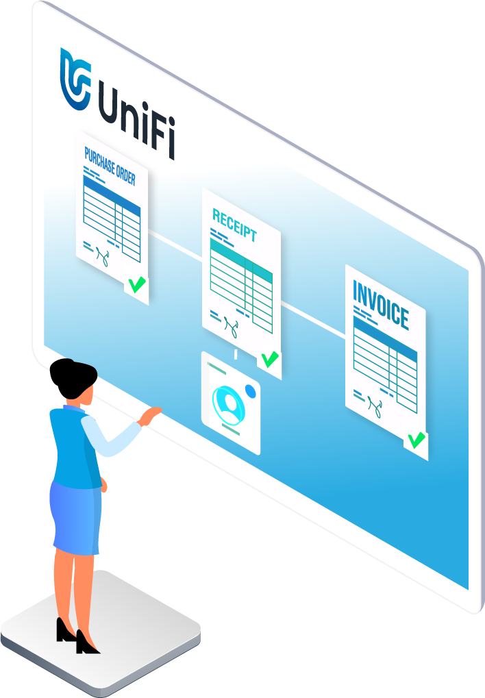 UniFi will automatically match a purchase order, an invoice, and the receipt for goods ordered and quickly review the invoice line items and details to ensure everything is accurate.